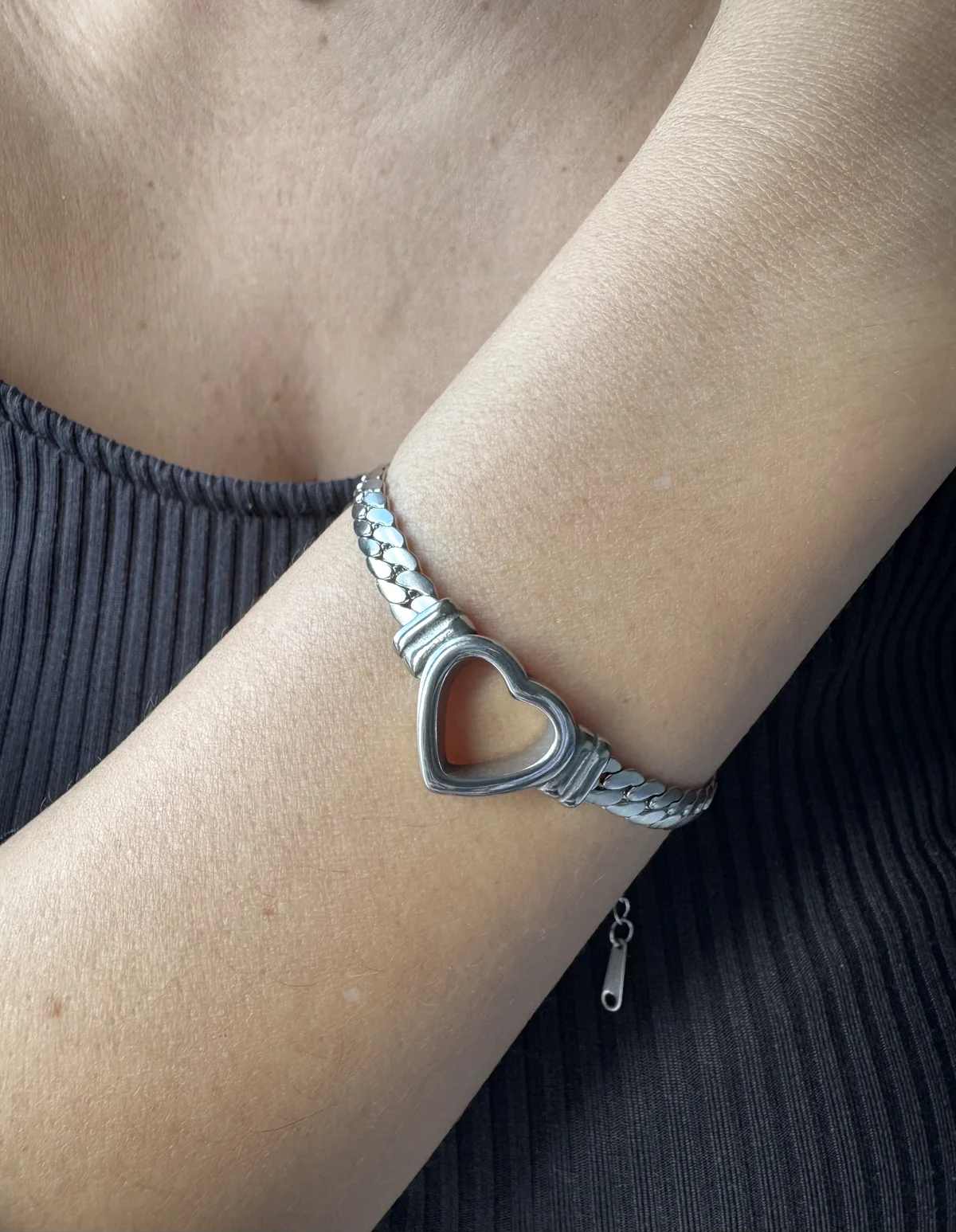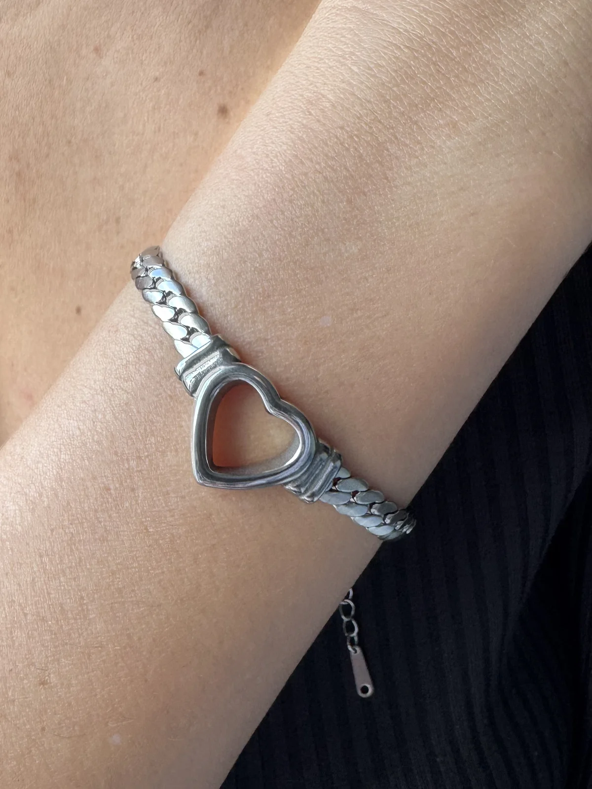 Ασημί ατσάλινο βραχιόλι με χαρακτηριστική καρδιά διάστασης και πλακέ αλυσίδα