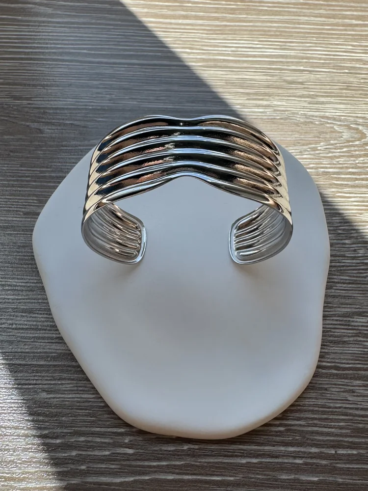 Απογειώστε το στιλ σας με το εντυπωσιακό βραχιόλι μανσέτα, ένα statement κόσμημα που τραβάει όλα τα βλέμματα. Το φαρδύ, ασημί σχέδιο του με τις κομψές, κυματιστές ρίγες δημιουργεί μια αίσθηση κίνησης και πολυτέλειας.