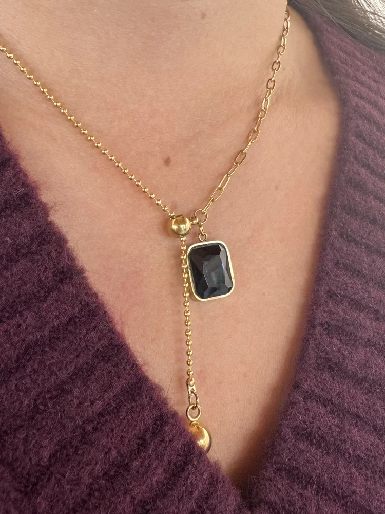 Σύγχρονο κολιέ από ατσάλι με χρυσό τόνο, συνδυάζοντας διαφορετικά είδη αλυσίδας. Το μενταγιόν αποτελείται από έναν κομψό ορθογώνιο μαύρο κρύσταλλο σε χρυσό πλαίσιο, που κρέμεται από την αλυσίδα και ολοκληρώνεται με μια ατσάλινη μπίλια.