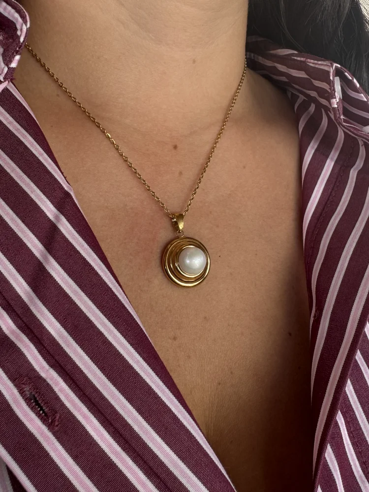 Κομψό ατσάλινο κολιέ με λεπτή χρυσή αλυσίδα και στρογγυλό μενταγιόν. Το κεντρικό στοιχείο είναι μια λευκή πέρλα, πλαισιωμένη από έναν μεταλλικό δακτύλιο, προσφέροντας μια διακριτική και κομψή πινελιά σε κάθε εμφάνιση.