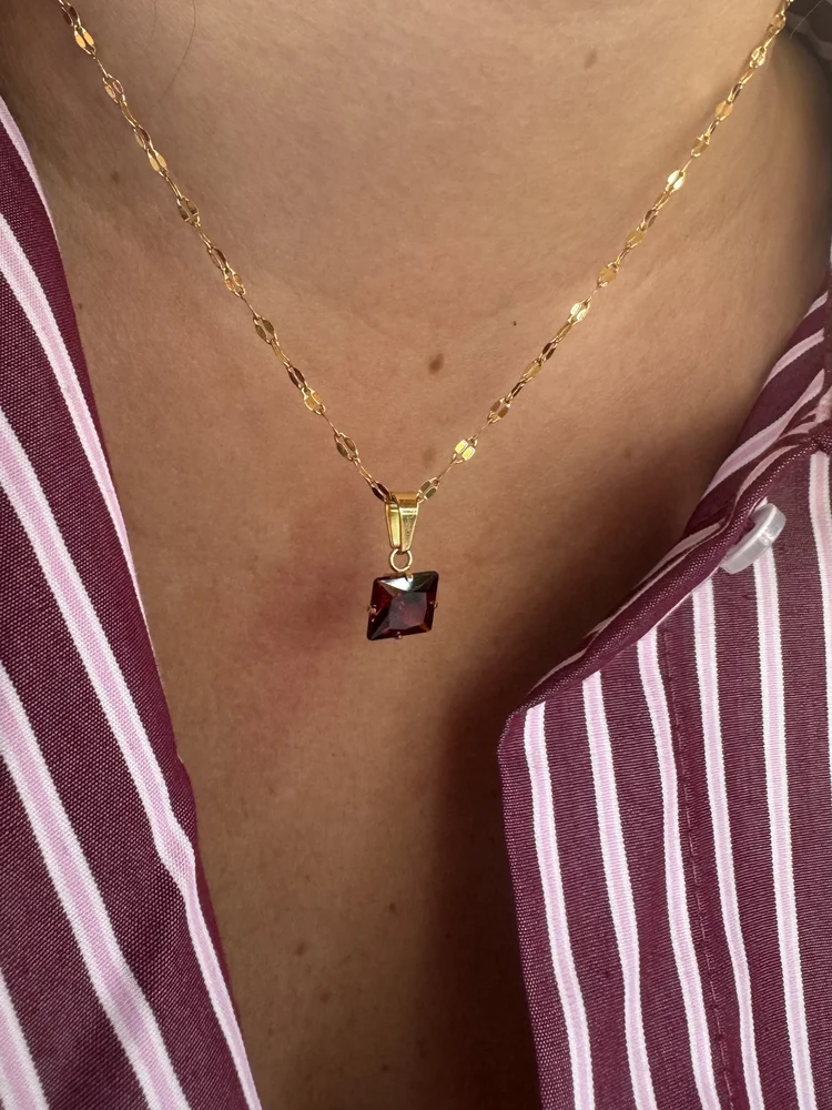 Χρυσό κολιέ από ατσάλι με λεπτή αλυσίδα και μικρό τετράγωνο κρύσταλλο σε βαθύ μπορντώ χρώμα. Ιδανικό για καθημερινή χρήση ή layering, προσθέτει διακριτική αλλά κομψή λάμψη σε κάθε εμφάνιση.