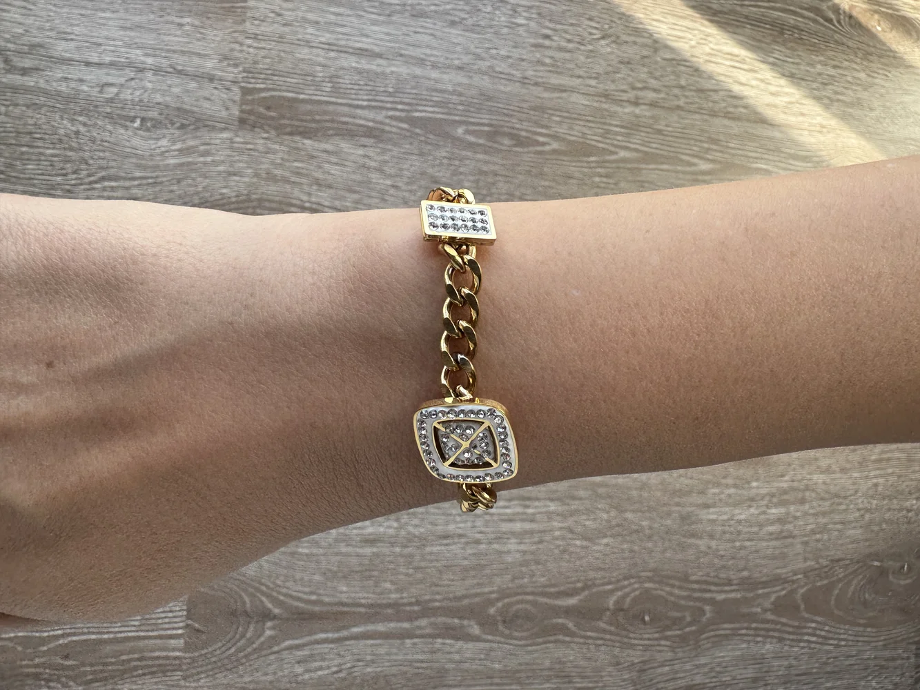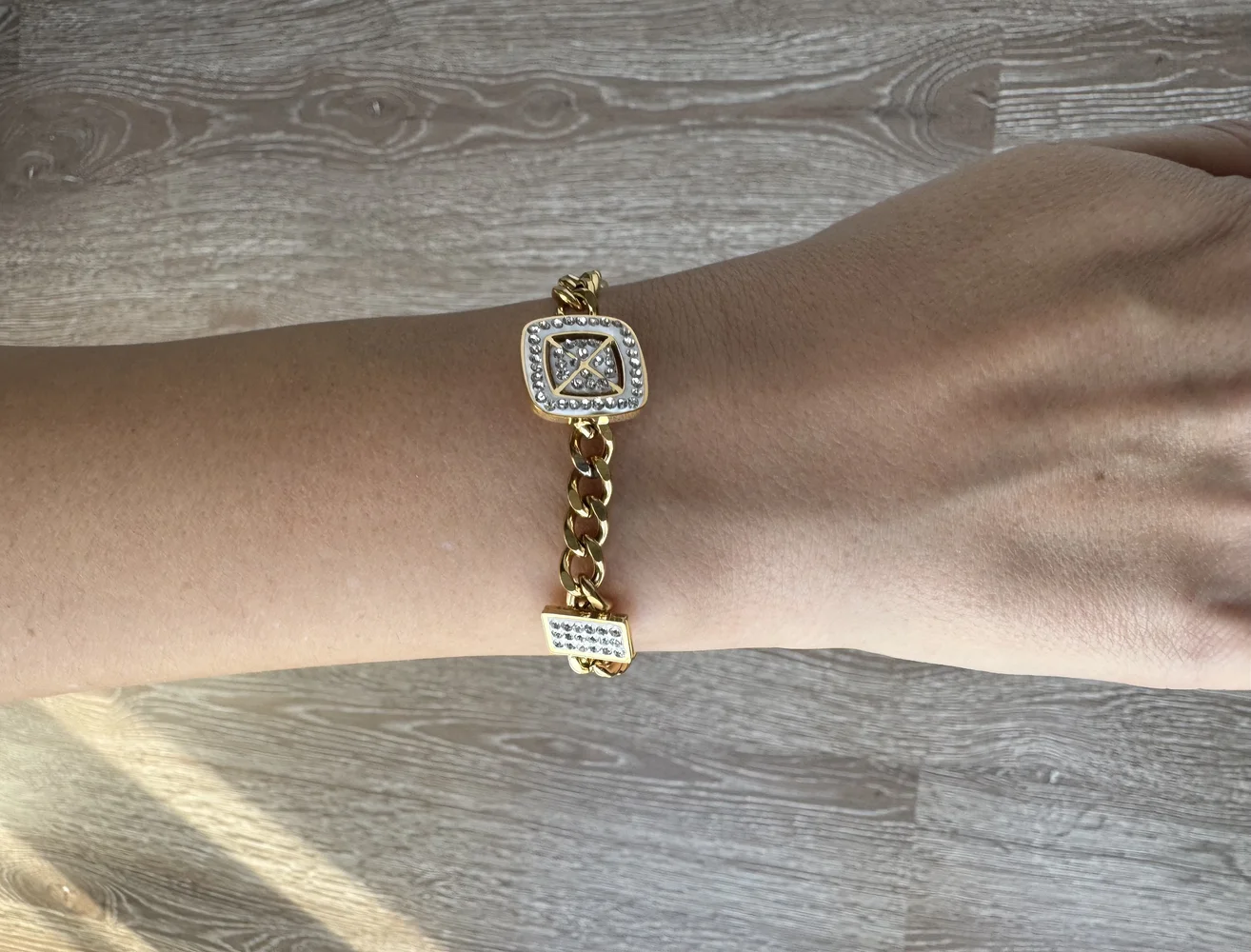 Βραχιόλι σε χρυσό τόνο με αλυσίδα τύπου Gourmette. Στην αλυσίδα υπάρχουν δύο τετράγωνα στοιχεία, καλυμμένα με λευκά ζιργκόν. Ο συνδυασμός της χοντρής αλυσίδας με τα ζιργκόν δίνει ένα καθαρό και σύγχρονο αποτέλεσμα, κατάλληλο για καθημερινές και πιο επίσημες εμφανίσεις.