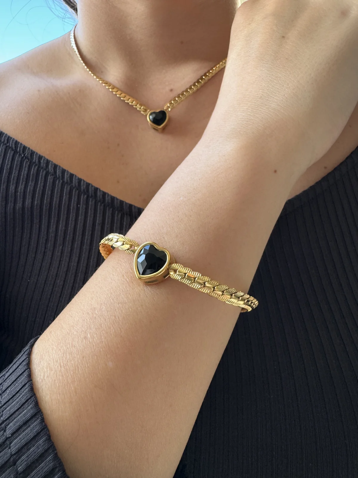 Βραχιόλι σε χρυσό τόνο με αλυσίδα τύπου Gourmette. Στο κέντρο υπάρχει στοιχείο σε σχήμα καρδιάς με μεγάλη μαύρη πέτρα. Ο συνδυασμός χρυσού και μαύρου δίνει μια καθαρή, σύγχρονη αντίθεση που ταιριάζει σε καθημερινές και βραδινές εμφανίσεις.