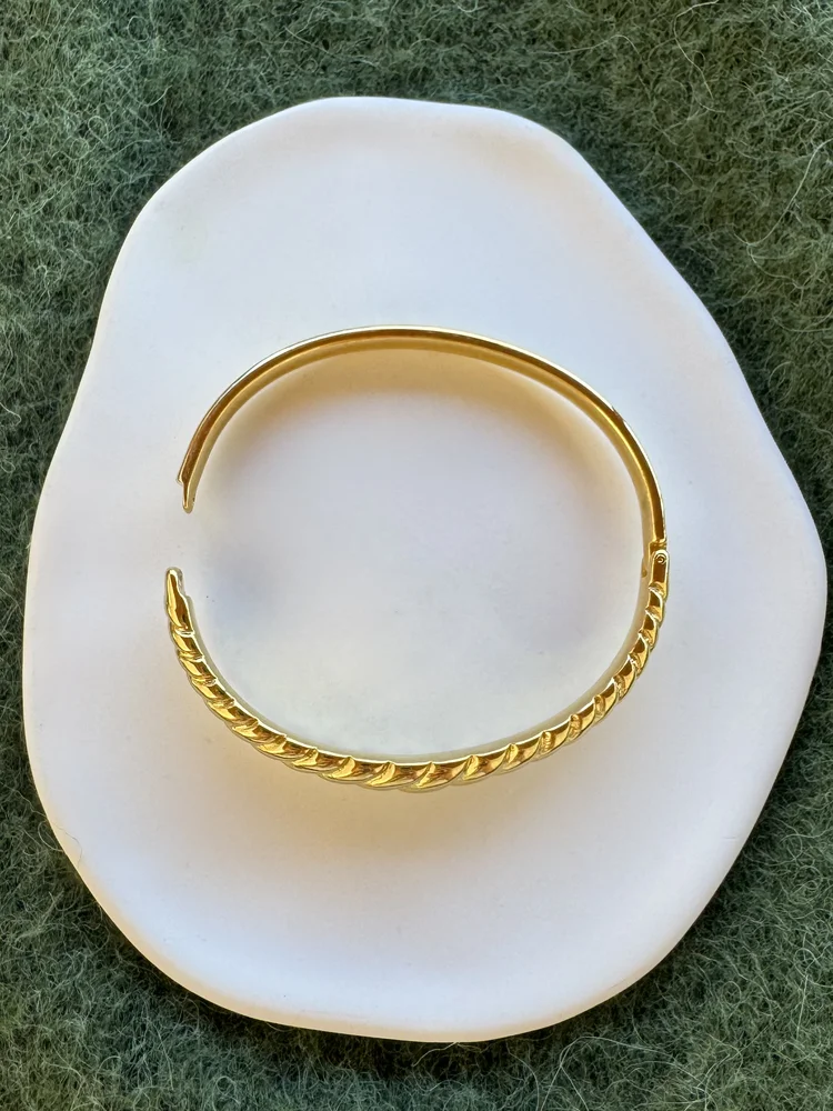 Φαρδιά ατσάλινη ανοιγόμενη χειροπέδα σε χρυσό τόνο με στριφτό (twisted) ανάγλυφο σχέδιο, που προσδίδει όγκο και υφή. Ένα διαχρονικό κόσμημα, ιδανικό για να φορεθεί μόνο του ή σε συνδυασμό με άλλα, προσφέροντας κομψότητα.