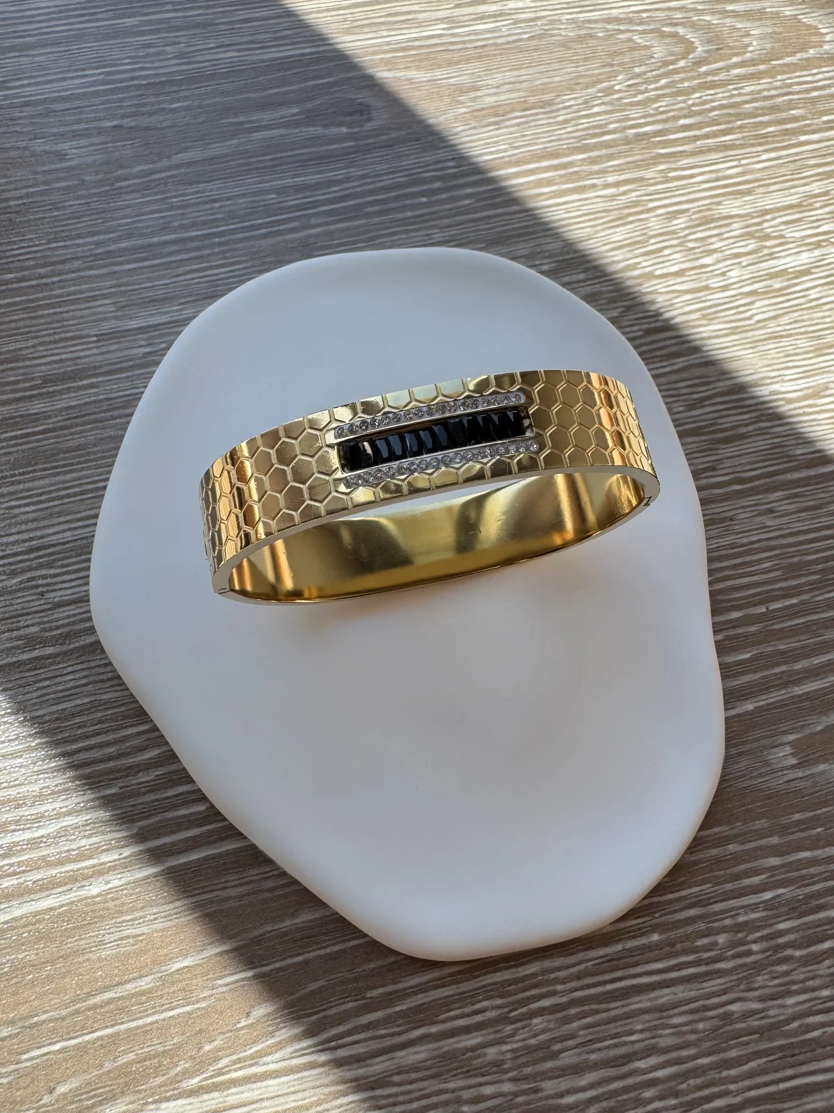 Χρυσή χειροπέδα με ανάγλυφο μοτίβο «κυψέλης». Στο κέντρο του ξεχωρίζει μια μαύρη ορθογώνια λεπτομέρεια, πλαισιωμένη από λαμπερά λευκά κρύσταλλα. Ένα μοντέρνο statement κομμάτι που αναδεικνύει κάθε εμφάνιση.