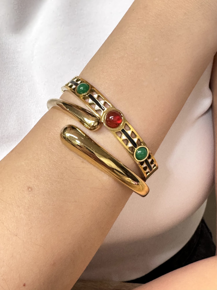 Κομψή χειροπέδα με καθαρές γραμμές και καμπύλες που αγκαλιάζει διακριτικά τον καρπό. Ο minimal σχεδιασμός της αναδεικνύεται μέσα από τη λεία, γυαλιστερή επιφάνεια, δημιουργώντας ένα σύγχρονο και διαχρονικό αποτέλεσμα.