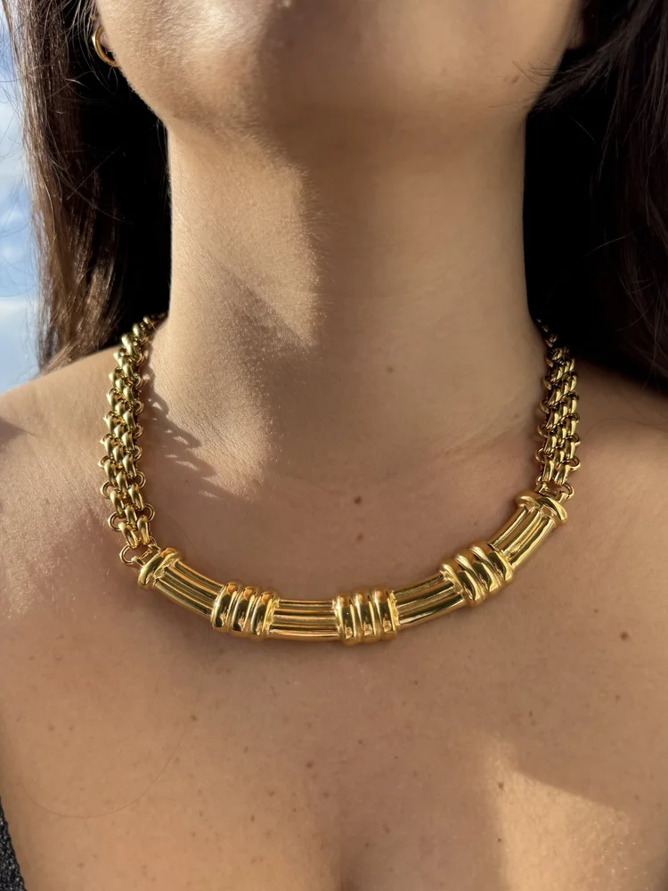 Ένα ατσάλινο κομψό χρυσό κολιέ. Διαθέτει πλούσιες αλυσίδες και κεντρική λεπτομέρεια με οριζόντια μεταλλικά στοιχεία.