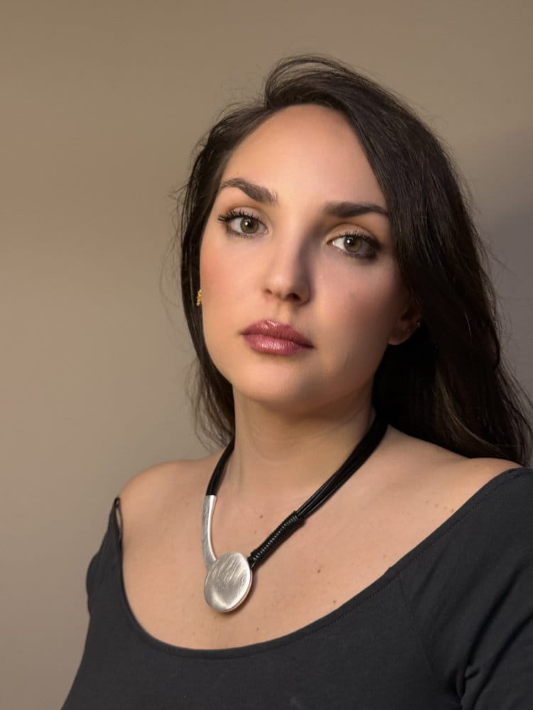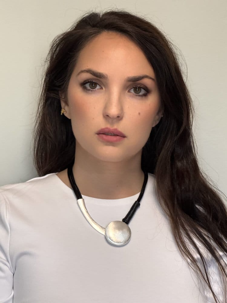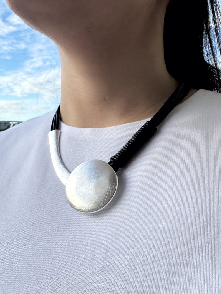 Το κολιέ αποτυπώνει τη σύγχρονη κομψότητα μέσα από έναν μίνιμαλ αλλά απόλυτα εκφραστικό σχεδιασμό. Το μαύρο στοιχείο από leather-effect υλικό (απομίμηση δέρματος) αγκαλιάζει αρμονικά τον λαιμό, δημιουργώντας έντονη αντίθεση με τις μεταλλικές ασημί λεπτομέρειες και το στρογγυλό statement στοιχείο στο κέντρο.