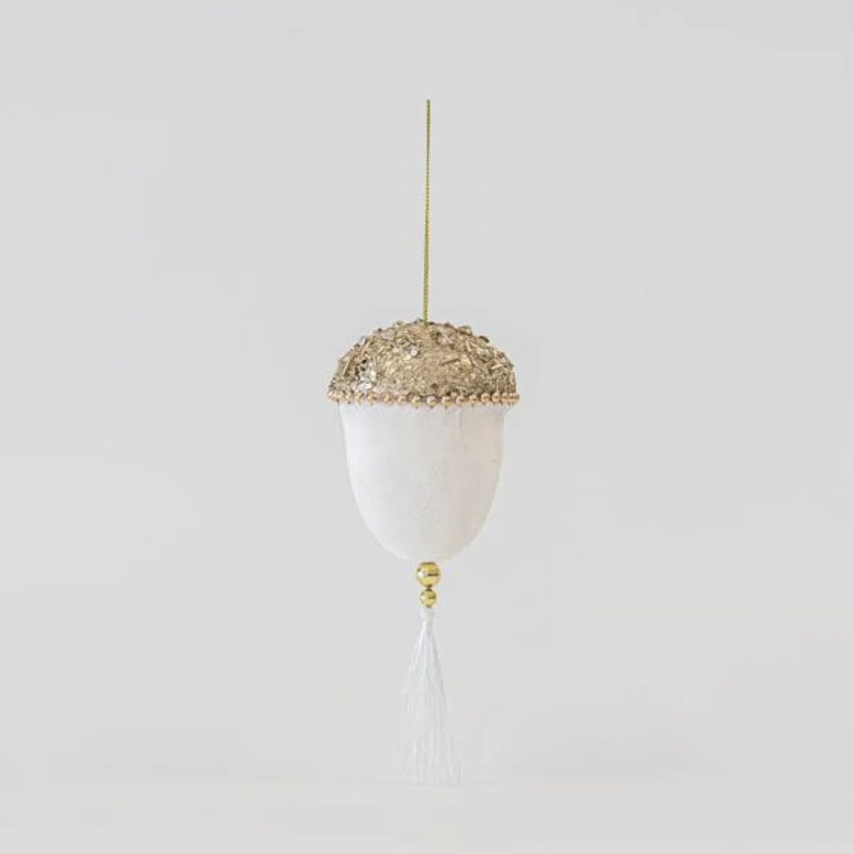 Ιδιαίτερο χριστουγεννιάτικο διακοσμητικό σε σχήμα βελανίδι, σε αποχρώσεις λευκό και χρυσού με λαμπερές λεπτομέρειες γκλίτερ. Ιδανικό για γιορτινή διακόσμηση σε τραπέζι, ράφι ή βιτρίνα, προσδίδοντας μια κομψή και παραμυθένια χριστουγεννιάτικη αίσθηση. Ταιριάζει υπέροχα σε elegant, glam ή winter wonderland στυλ διακόσμησης.